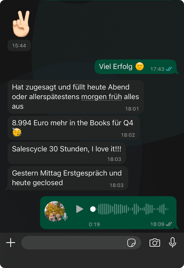 Dein Wettbewerb ist wahrscheinlich schon einen Schritt weiter oder ist gerade ebenfalls dabei, sich im Vertrieb zu professionalisieren. Du solltest deshalb keine Zeit mehr verlieren und schon gar kein Umsatz und jetzt mit uns sprechen! Buch Dir hier ein erstes Feedback für Deine Sales Pipeline!