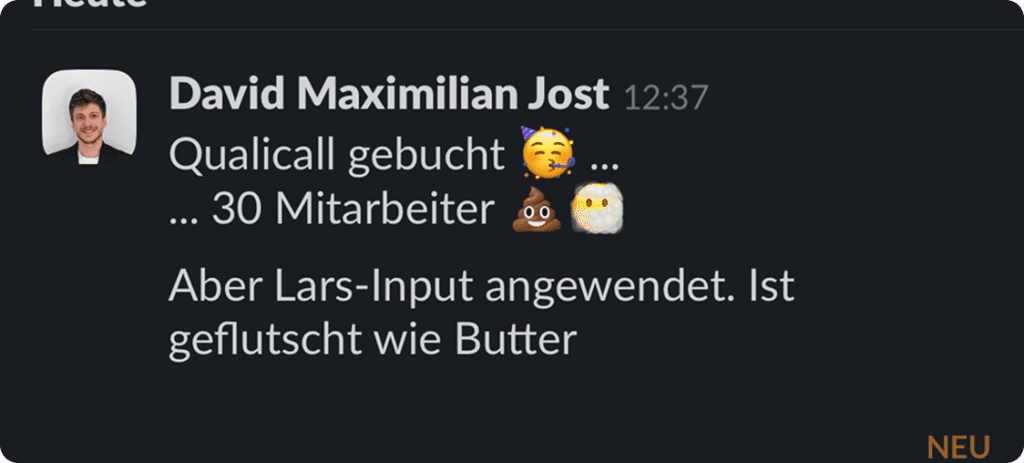 Im Zuge unseres Wachstums benötigten wir ein passendes Training, um unsere SDR- und AE Teams vollumfänglich zu schulen. Lars übertraf unsere Erwartungen und war ein wichtiger Baustein für das Team. Er griff dabei nicht nur live zum “Hörer”, sondern teilte auch Wissen, das blieb. Ergebnis: 2x so viel Sales Activity und ein hochmotiviertes Team!